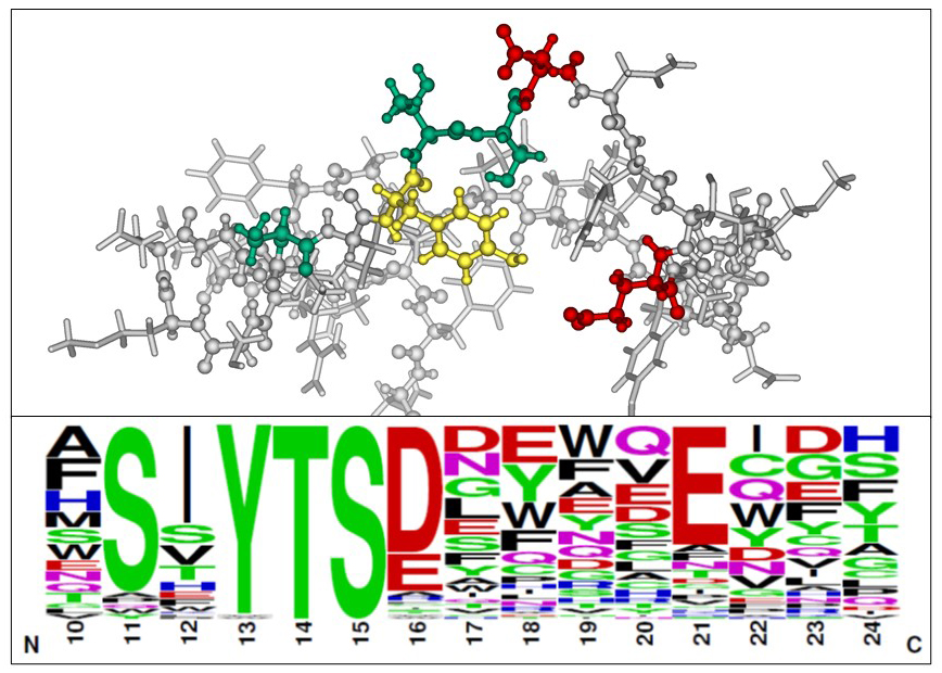 Epitop-Fingerprint eines anti-muCD184 Antikörpers: In der Struktur erkennt der Antikörper nur bestimmte Aminosäuren, was sich auch in der statistischen Verteilung im Weblogo zeigt. (S. Santa-ardharnpreecha, Praktikum, Fraunhofer IZI, 2018; D. Wehrmann, epitopic)